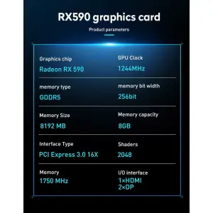 1. [High Performance] RX590 8GB GDDR5 256bit graphics card with powerful image processing, 2304 units cores, 1244MHz core frequency and 8000MHz video memory frequency.